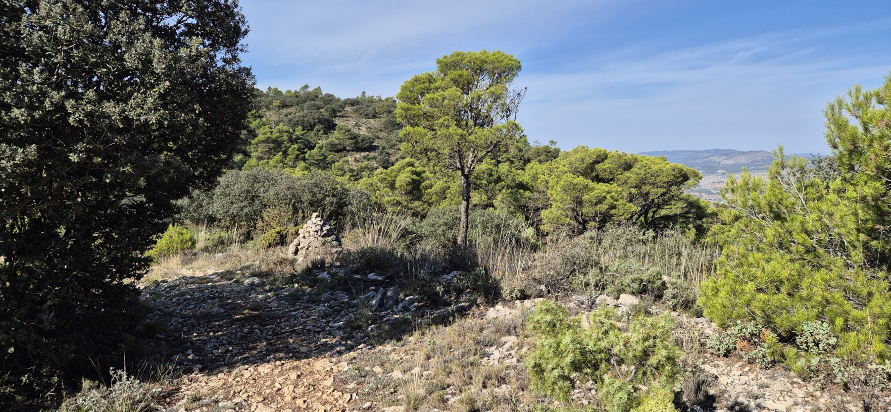 Ab da ging es ein Stück auf dem Cami La Bassa weiter und bogen bald rechts in einen weiteren Wanderpfad ab. An Weinreben entlang ging es wieder etwas hoch in einen lichten Pinienwald. Auf einem schmalen Wanderweg weiter an der Südseite des Hausberges von Llíber entlang. Immer mal mit Blick auf die Weinrebenfelder werfend, kamen wir bald bei dem Mirador Llíber an.