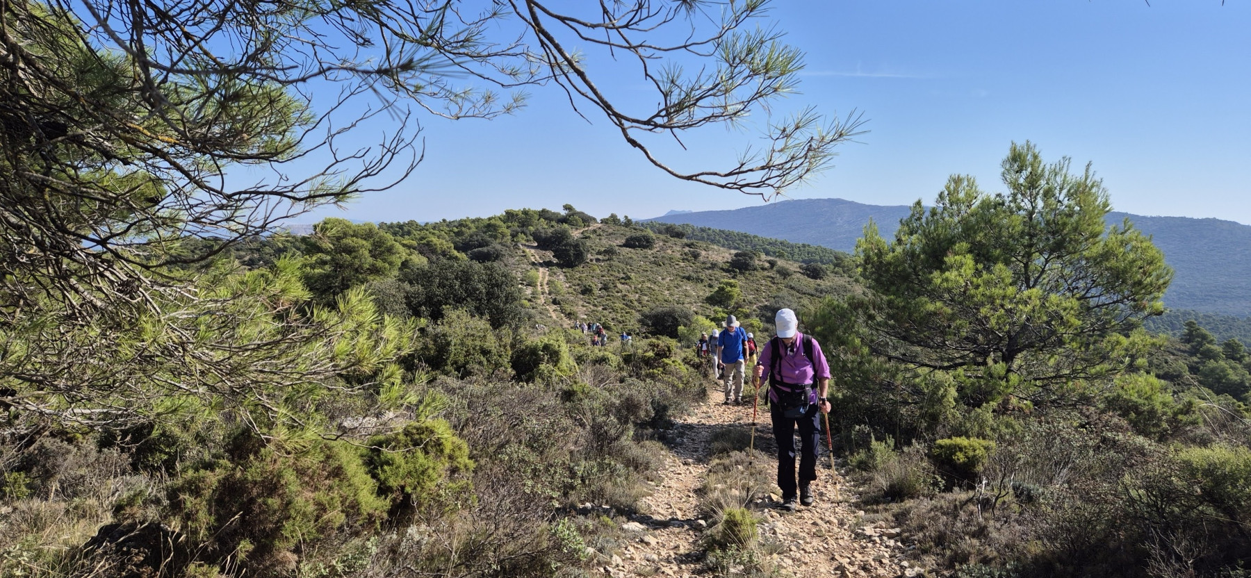 Ab da teilte sich die Wandergruppe von 37 Personen. 10 Wanderer gingen mit Suscha zum Cima El Cremat o Penya Pina auf (1242 m). Die anderen 27 Personen machten mit mir die Rundwanderung zum Cabec de Corbó auf ca. (1204 m) und retour an dem Refugio Esbarzerets Ibi vorbei.