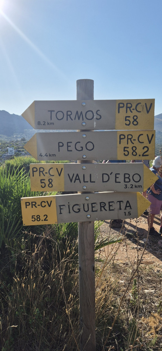 Unsere Rundwanderung ging zuerst auf einem Serpentinenartigen Wanderweg hoch bis zu einer Kreuzung mit Wanderschilder, von da aus man zum Kreuz (La Creu de Senija) zur Cova de la Garganta oder weiter bis nach Lliber Wandern könnte.