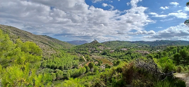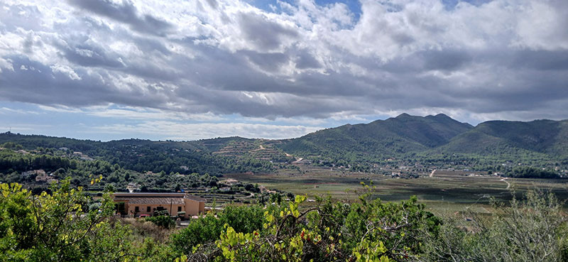 Start und Ziel war ein kleiner Waldparkplatz in der Cami Tarraula. Ein paar erste Höhenmeter und die Sicht auf die Höhenlagen von Rebaldi, Cumbre und Tossal Gros lassen den Blick schweifen. Und dann um zwei Ecken wieder in Richtung des Riu Gorgos und eine Landschaft, die sich mit der Toskana messen kann. Naturflecken, Kulturbäume, kleine Felder und der weite Blick über das Tal zwischen Javea und Gata. Wieder ein kleiner Anstieg, vorbei an herrschaftlichen Anwesen im traditionellen Stil. Den typischen modernistischen „Ibiza Style“ sucht man zum Glück hier in dieser Gegend vergebens.